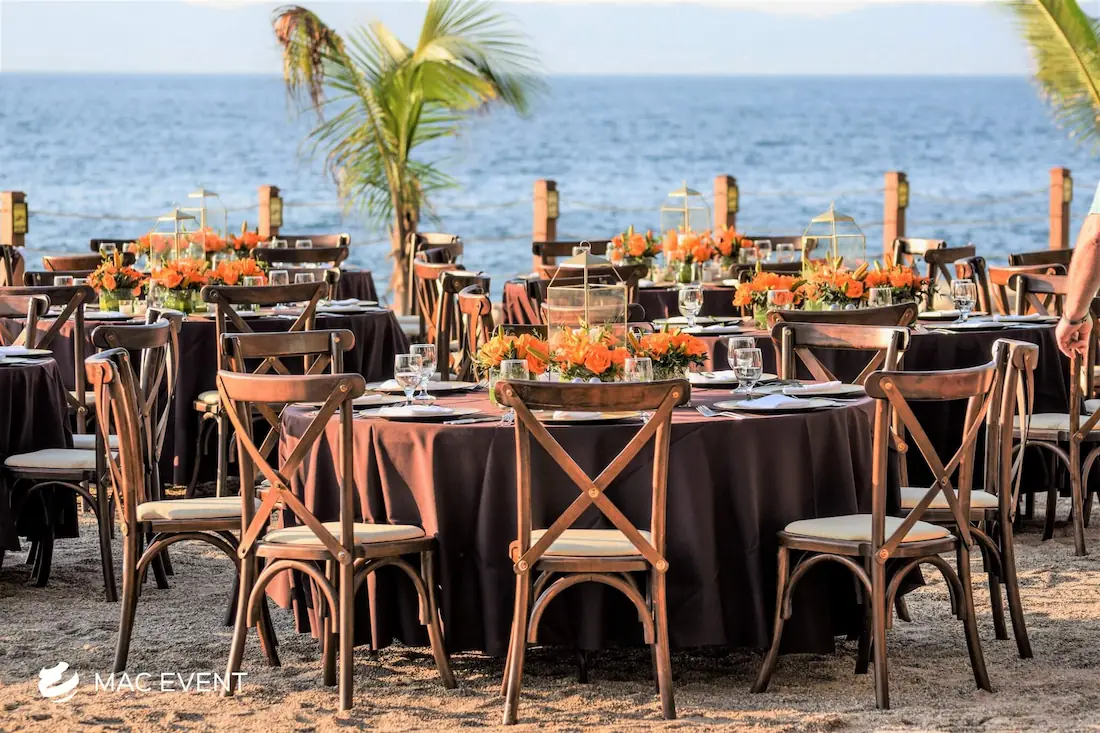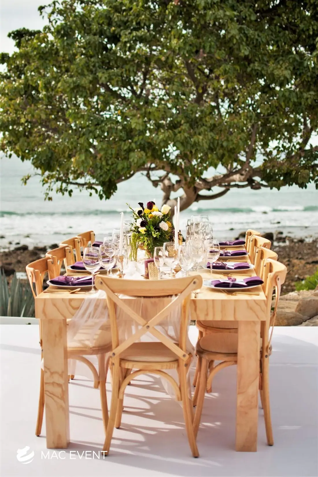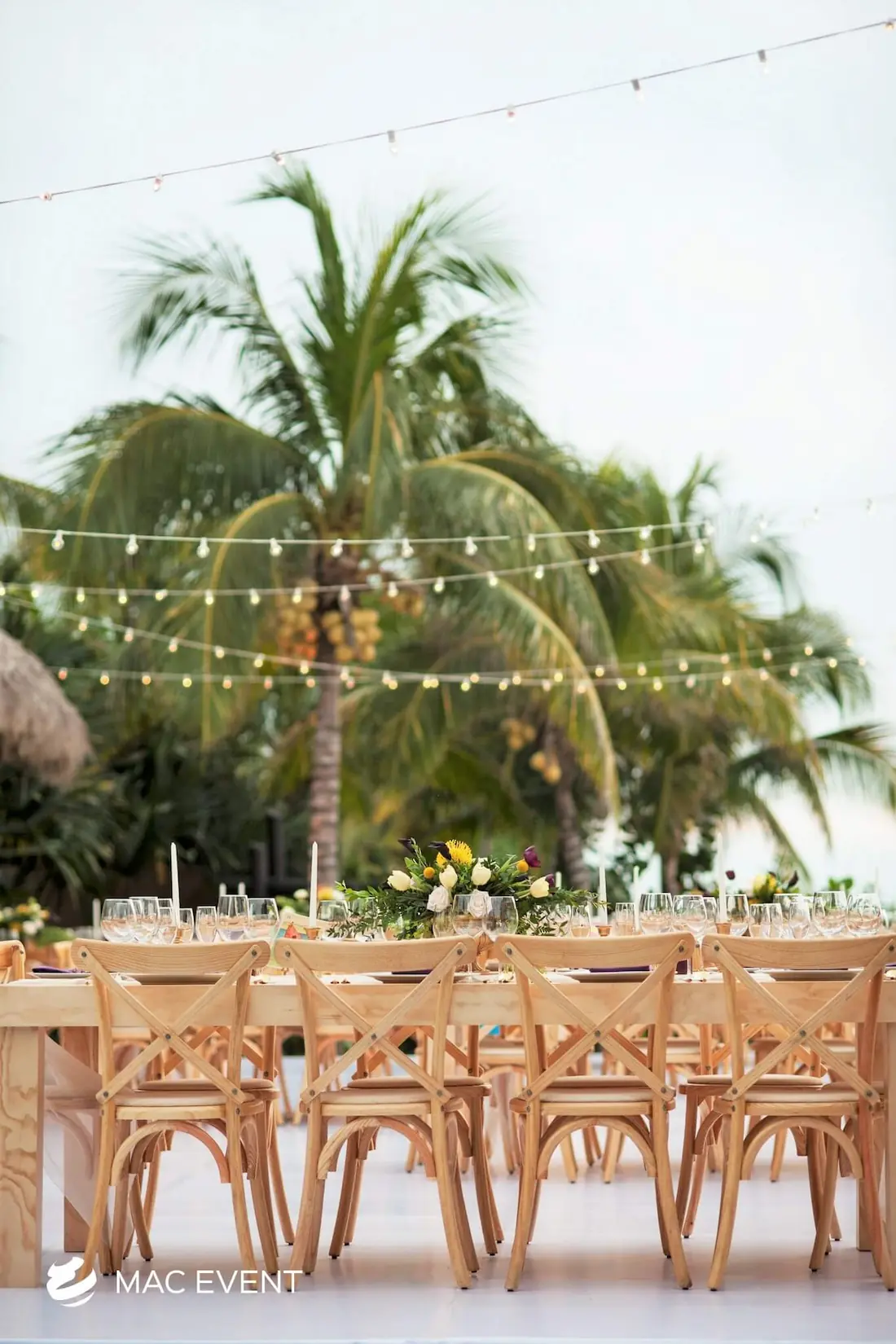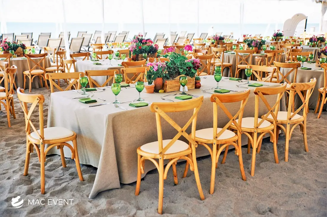 Our cross back chairs are a popular choice for rustic and elegant weddings and events in Holbox. Featuring a charming design and sturdy construction, they add a touch of country chic to your seating arrangements.